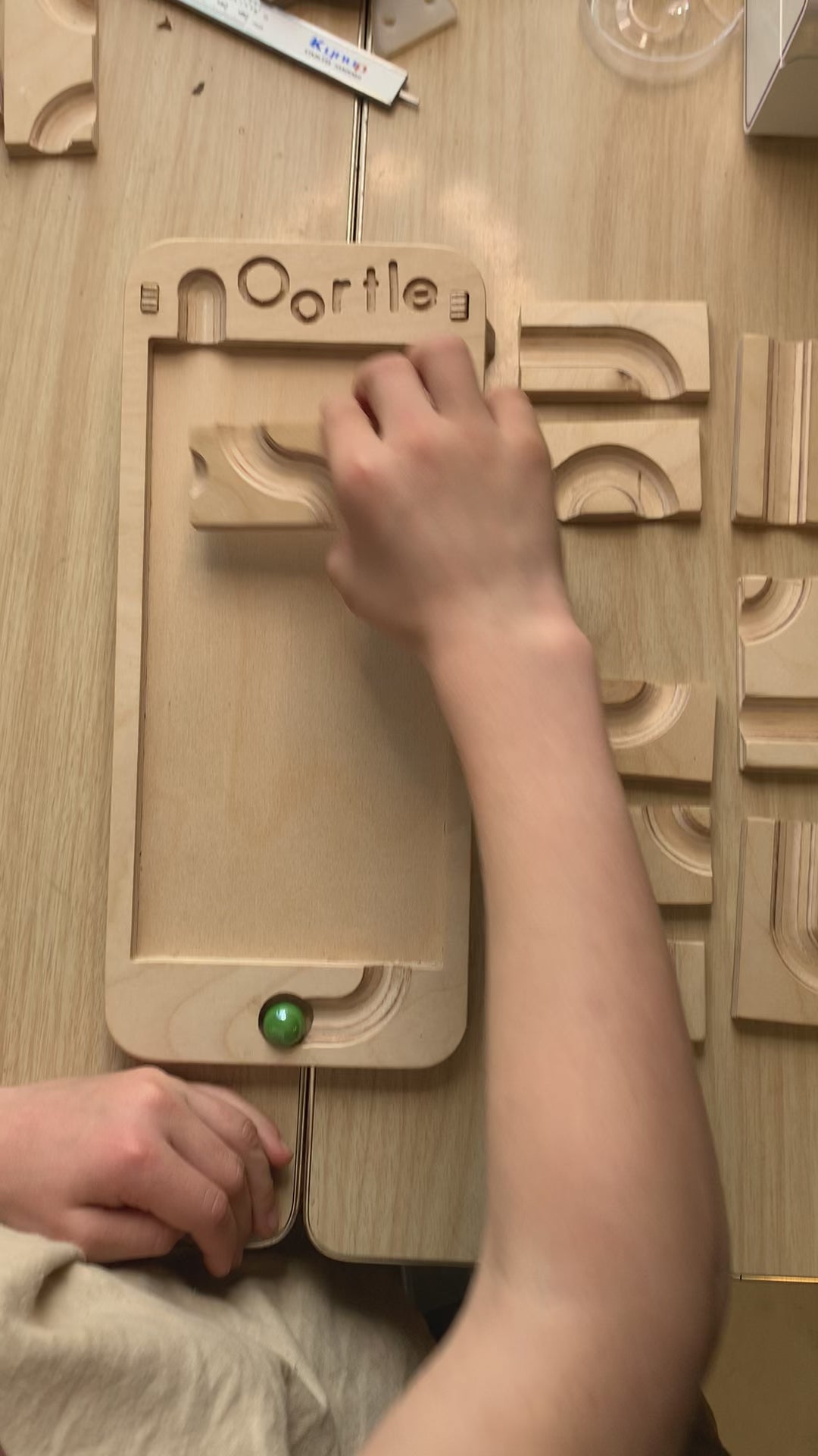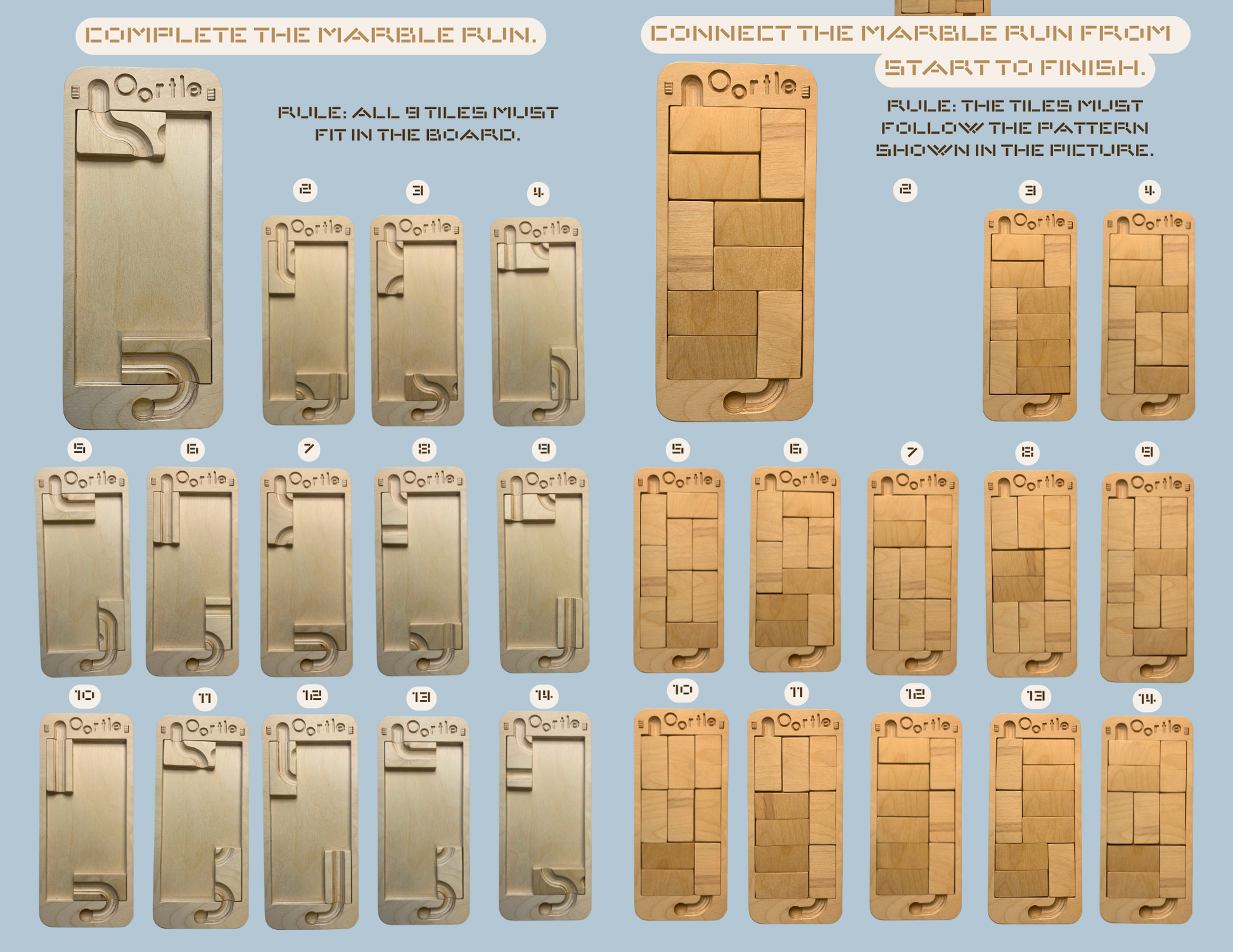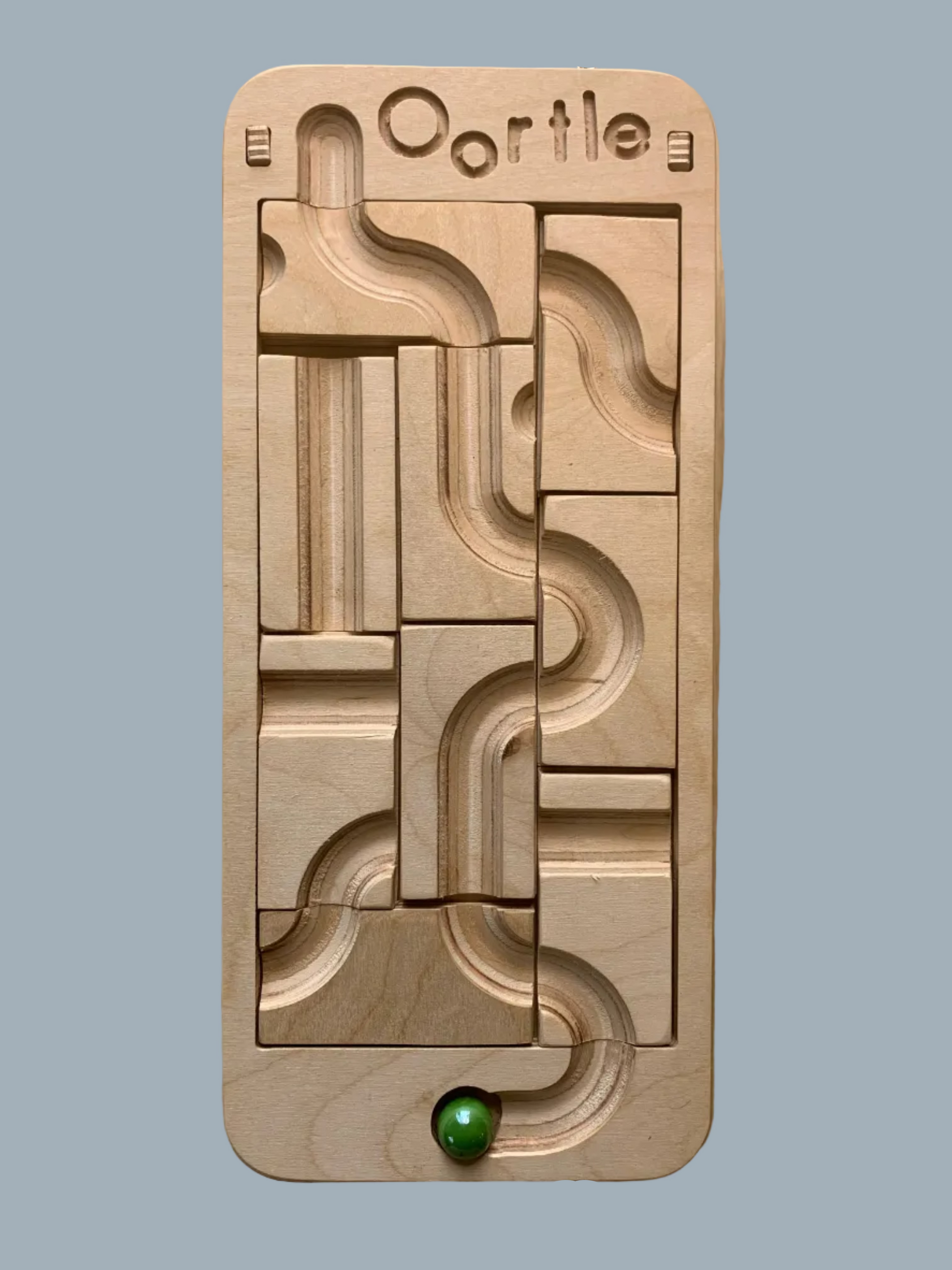 This wooden marble run puzzle is made even puzzlier by the fact that each of its 9 rectangular tiles are unique. And because they are rectangles, the rotation affects the pattern that the other tiles can be placed. Comes with a puzzle sheet of 28 puzzle variations.