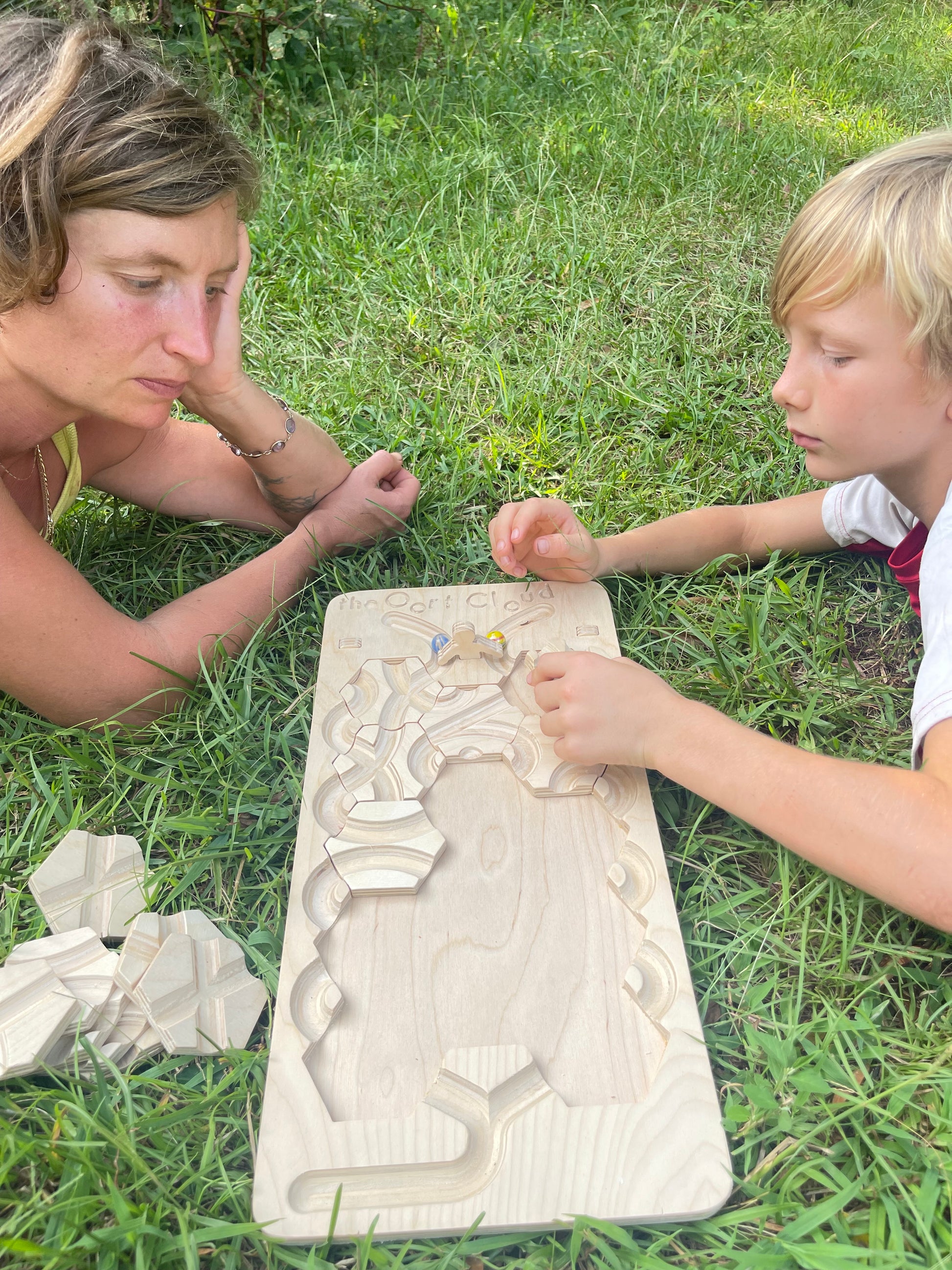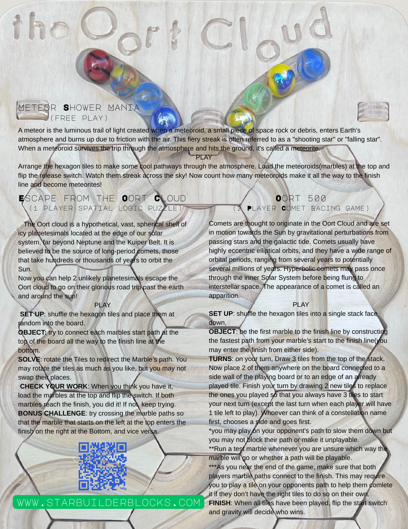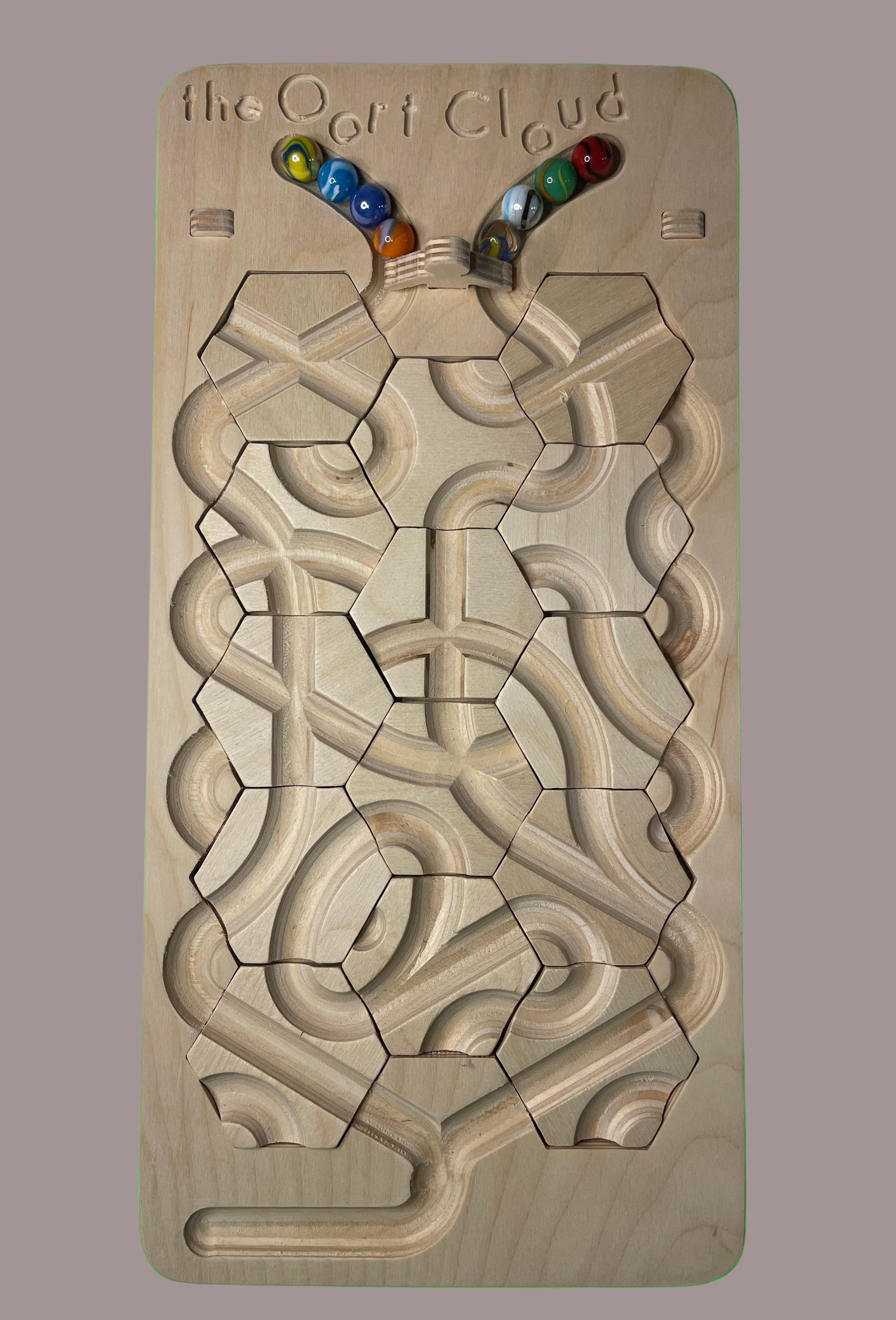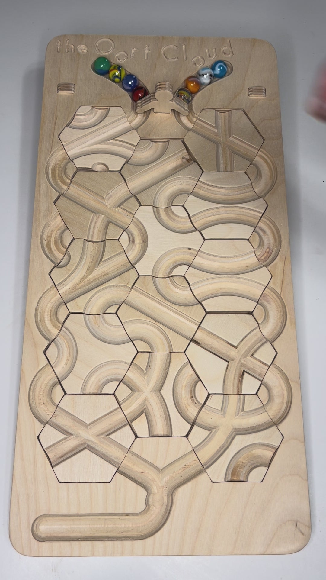 Oort 500 a 2 player marble racing game. Take turns placing the hexagon tiles onto the play board. Outmaneuver your opponent to create the fastest marble track. Like a mini game of chess where the winner is decided by a marble race at the end.