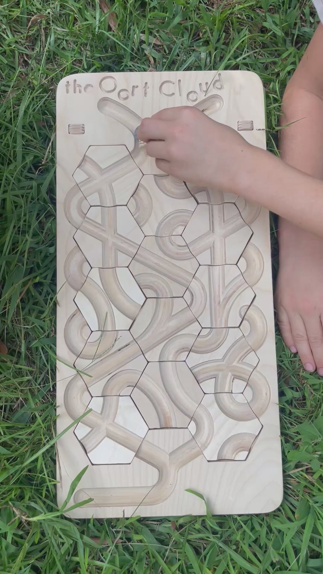 An artfully crafted, geometrically inspired, all wood marble track set. Arrange the wooden hexagon tiles into the play board to create infinite pathways. Change the arrangement and rotation of the tiles to discover new marble tracks. Place the marbles into the starting positions at the top of the board, flip the start switch, and race the marbles to the finish line at the bottom of the board to see which path is fastest!