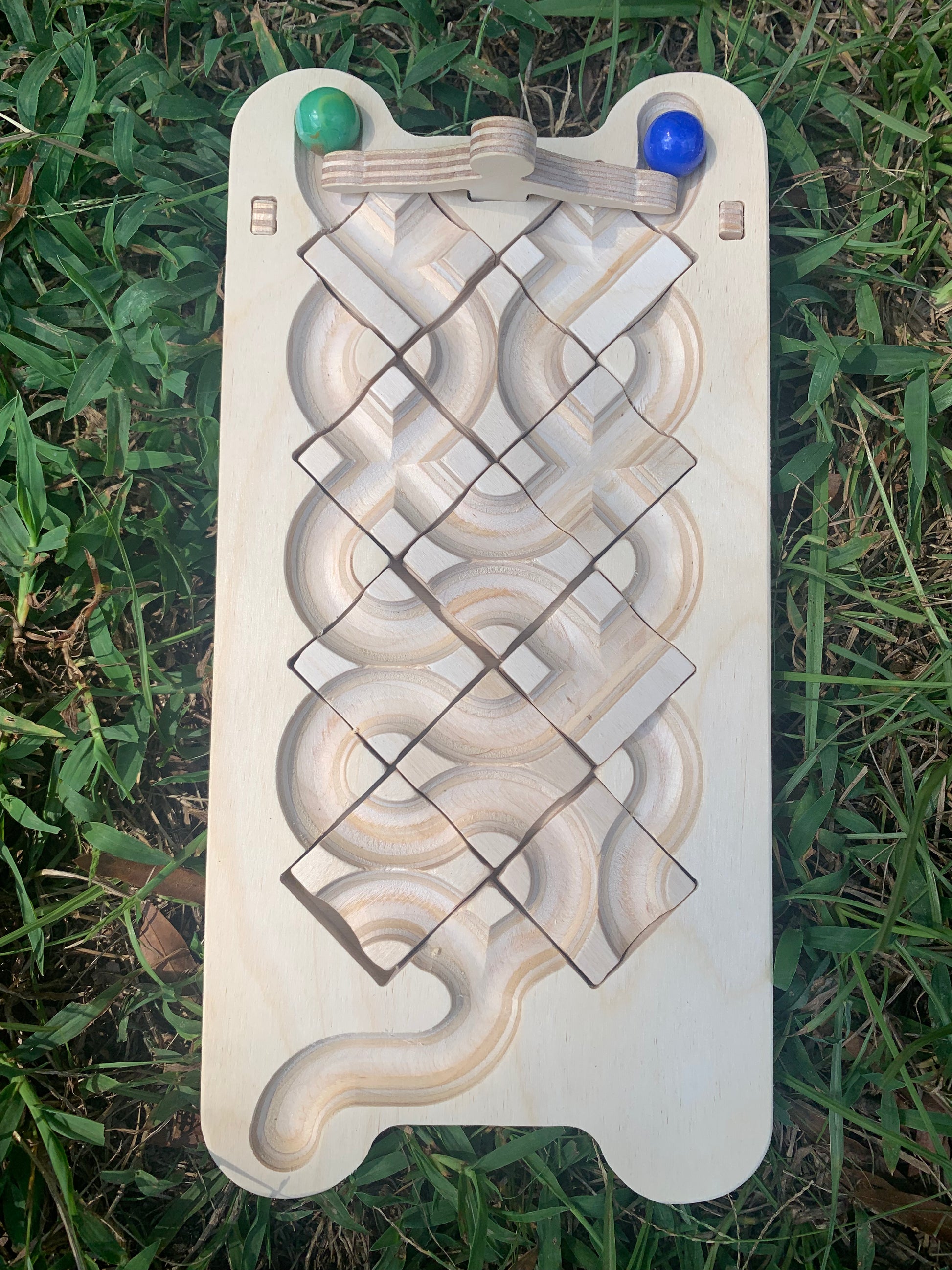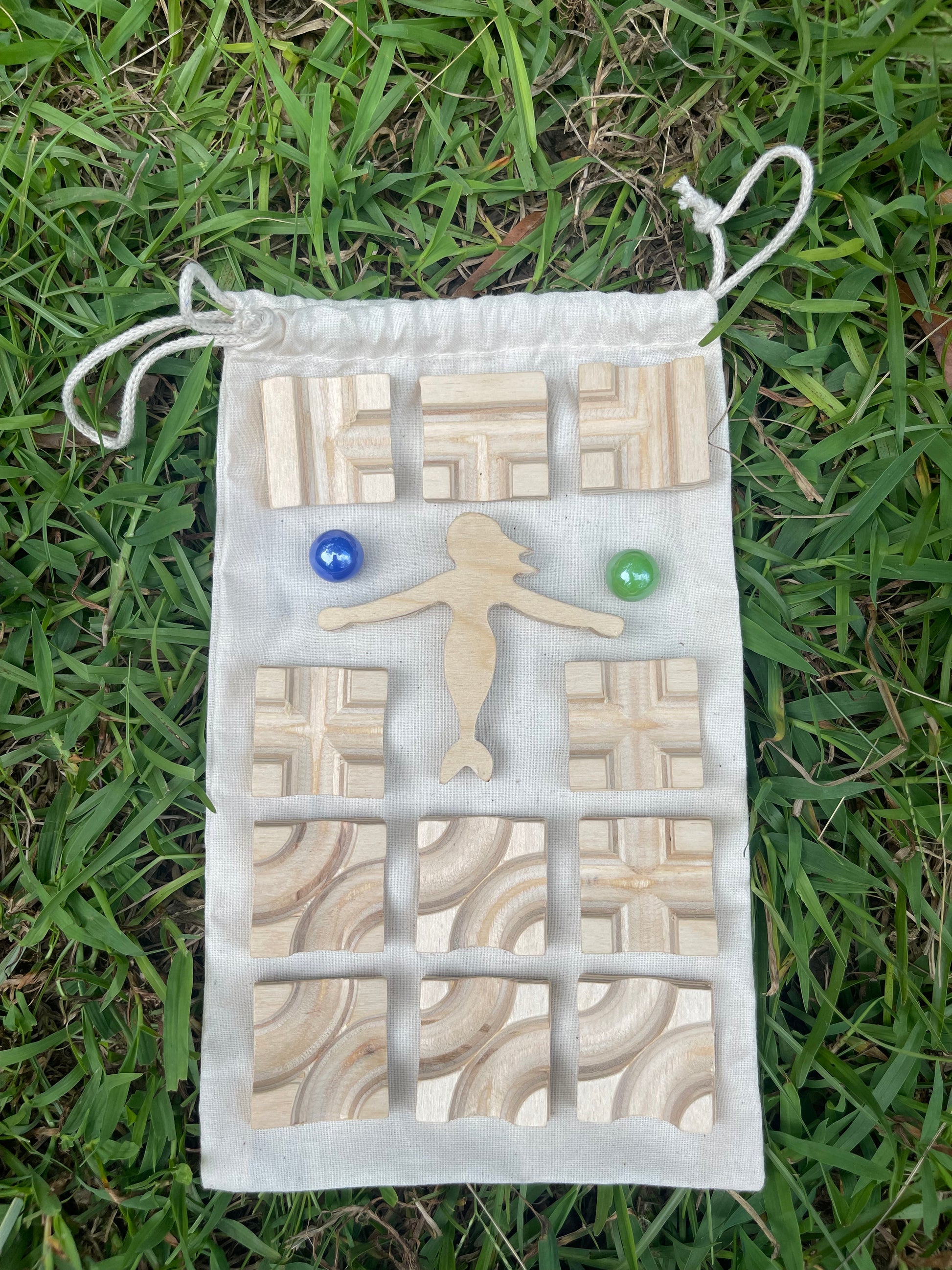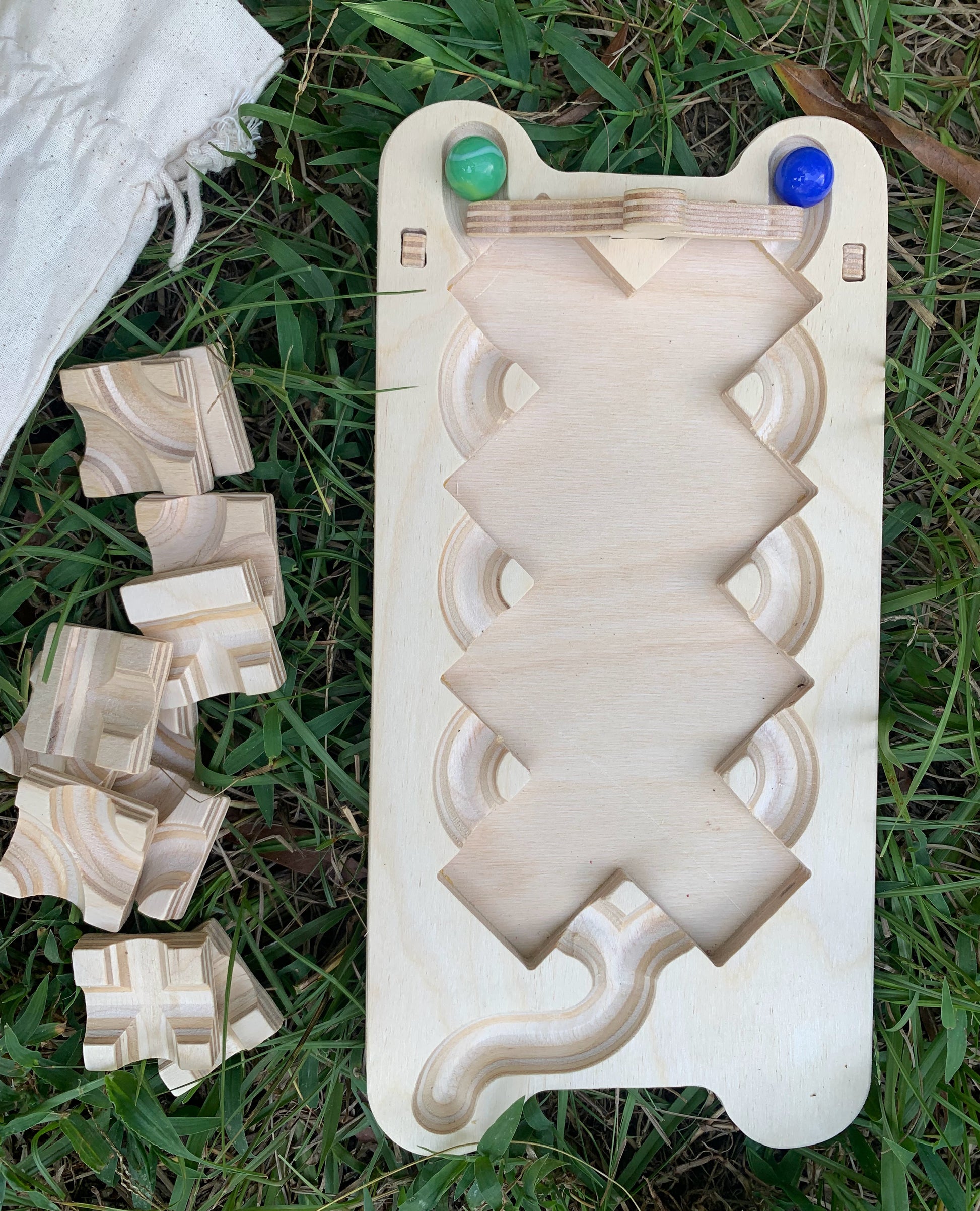 Includes 1 wooden playing board, 2 wooden legs, 1 marble release switch, 11 square tiles, 2 marbles
