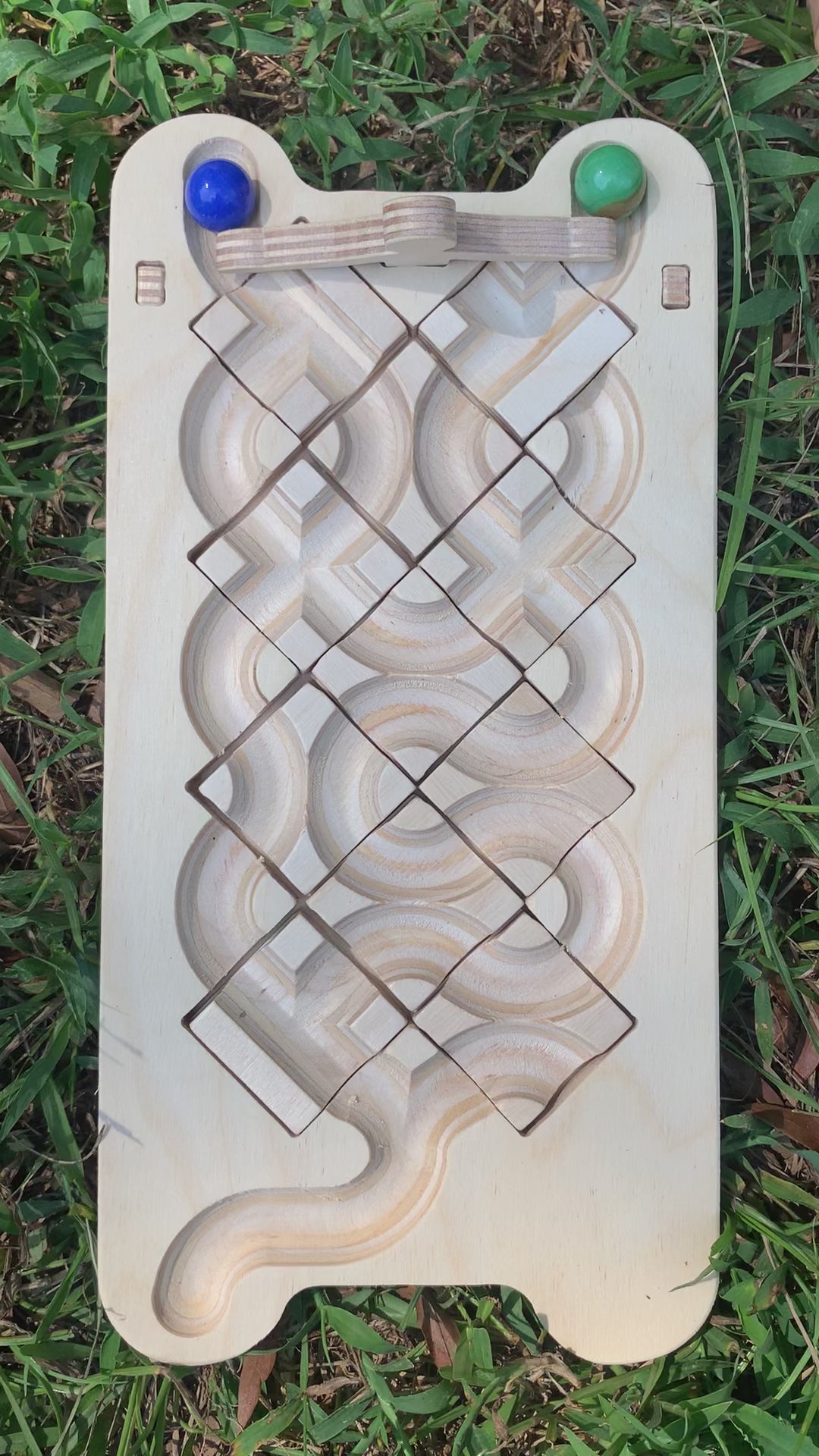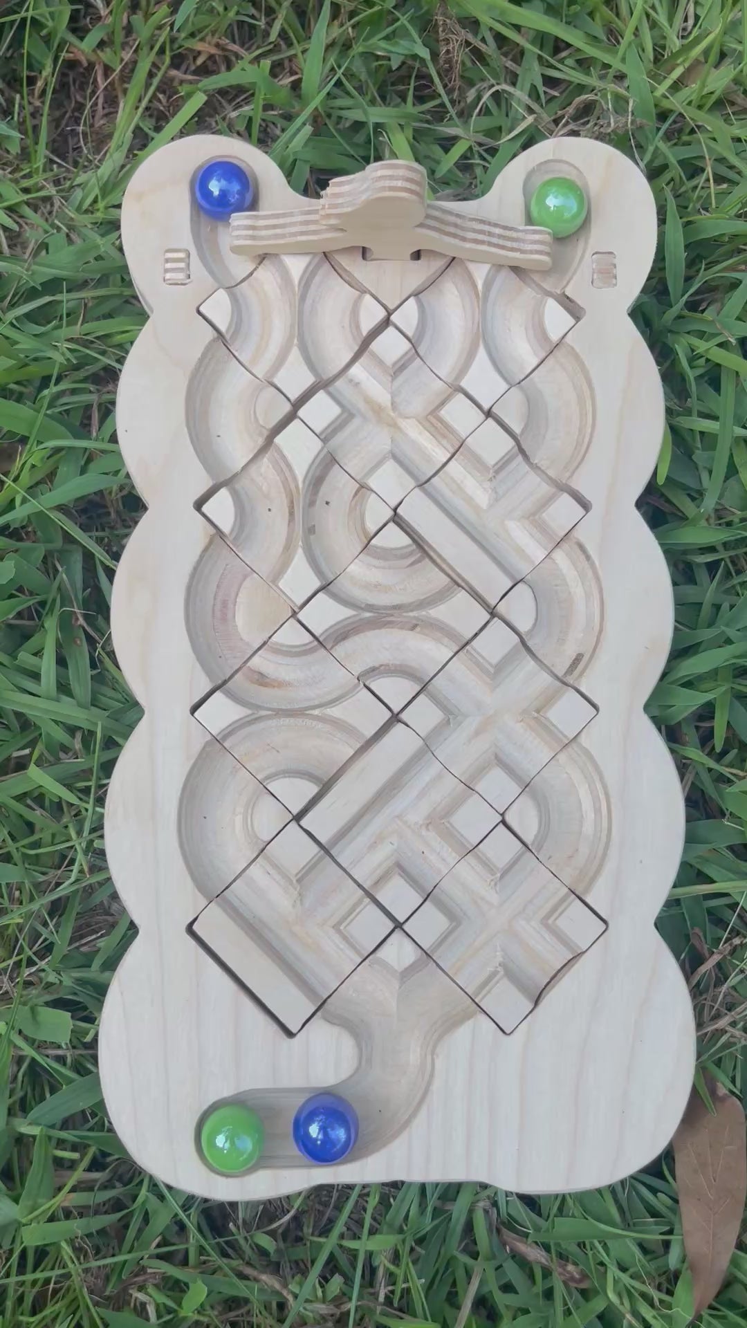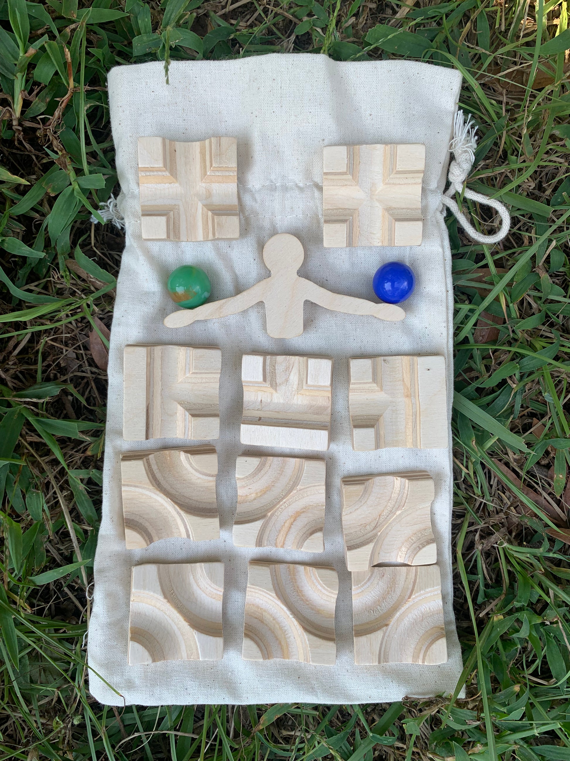Includes 1 wooden playing board, 2 wooden legs, 1 marble release switch, 11 square tiles, 2 marbles
