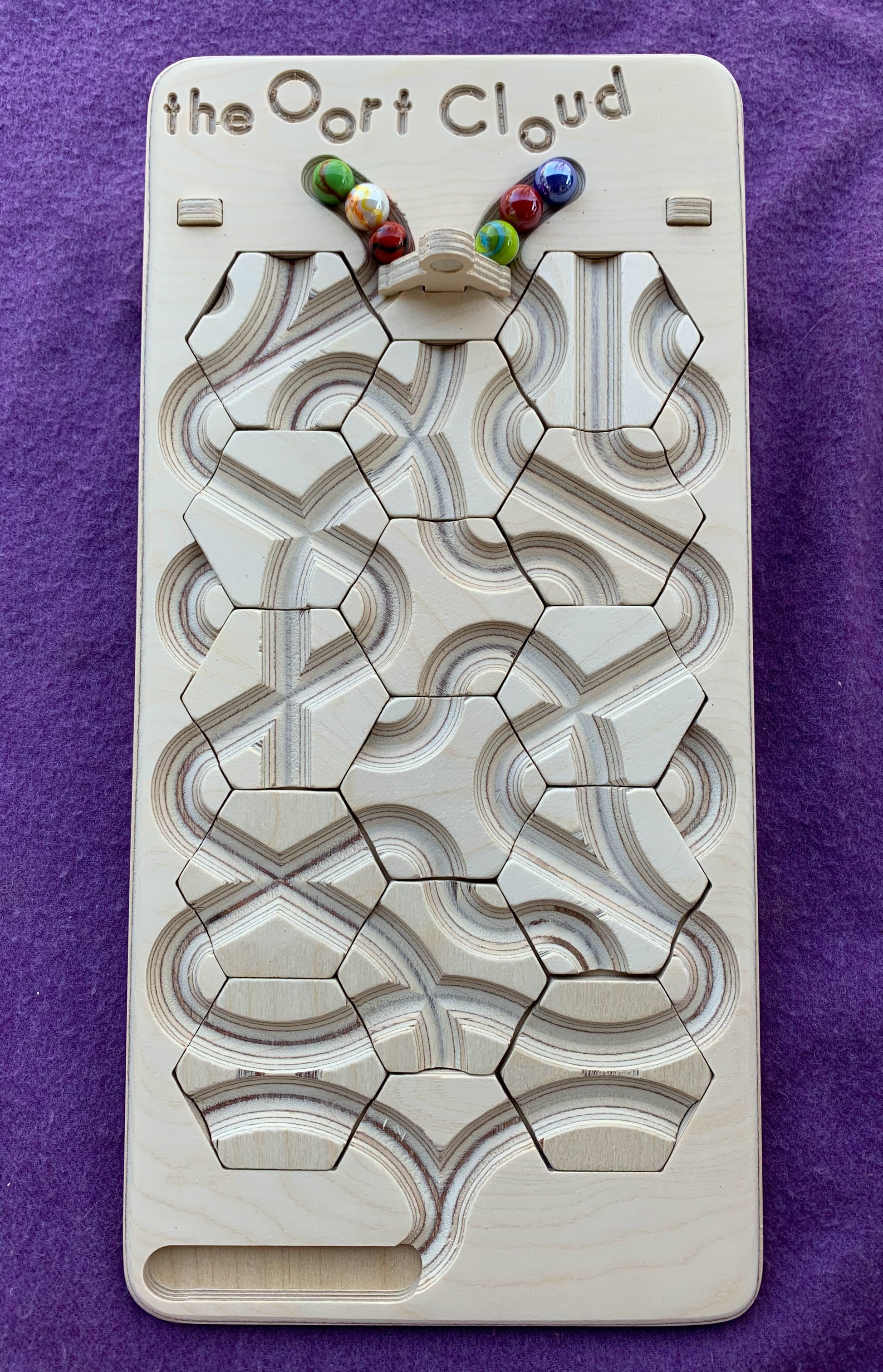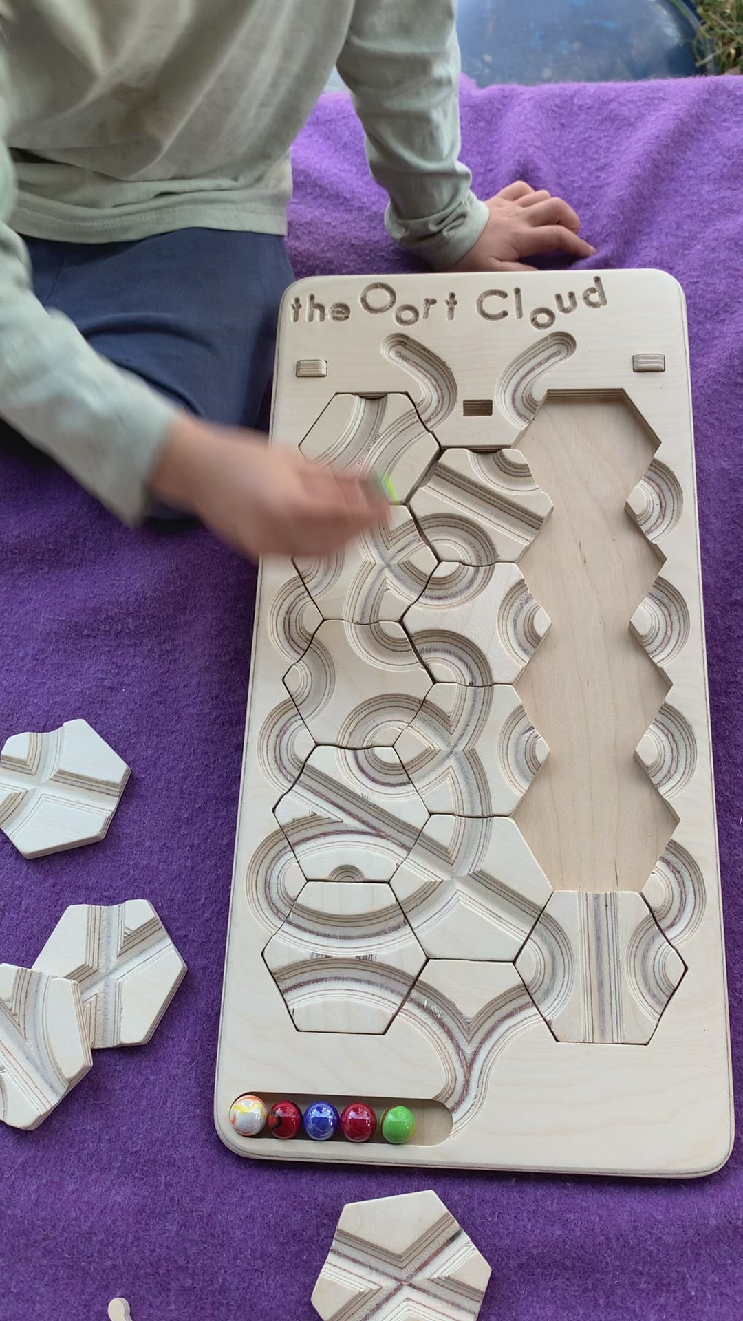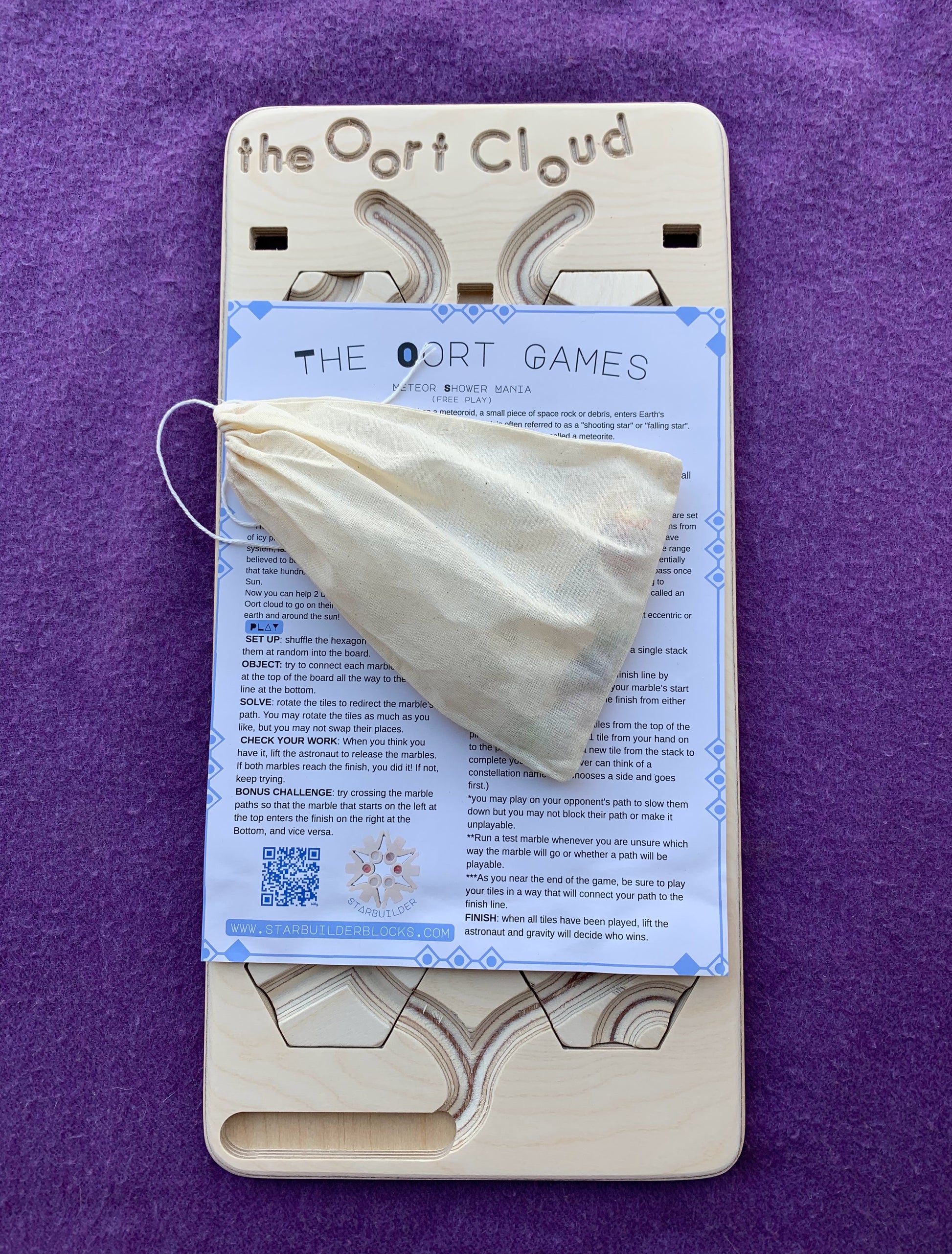 Oort 500 a 2 player marble racing game. Take turns placing the hexagon tiles onto the play board. Outmaneuver your opponent to create the fastest marble track. Like a mini game of chess where the winner is decided by a marble race at the end.