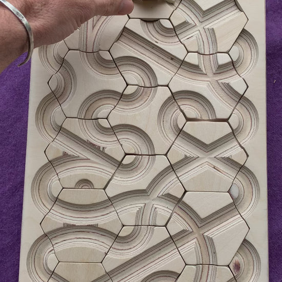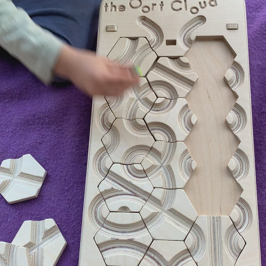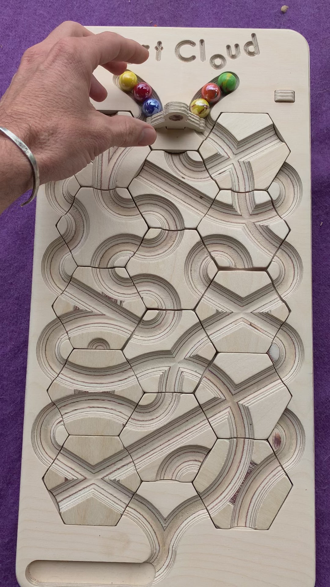 An artfully crafted, geometrically inspired, all wood marble track set. Arrange the wooden hexagon tiles into the play board to create infinite pathways. Change the arrangement and rotation of the tiles to discover new marble tracks. Place the marbles into the starting positions at the top of the board, flip the start switch, and race the marbles to the finish line at the bottom of the board to see which path is fastest!