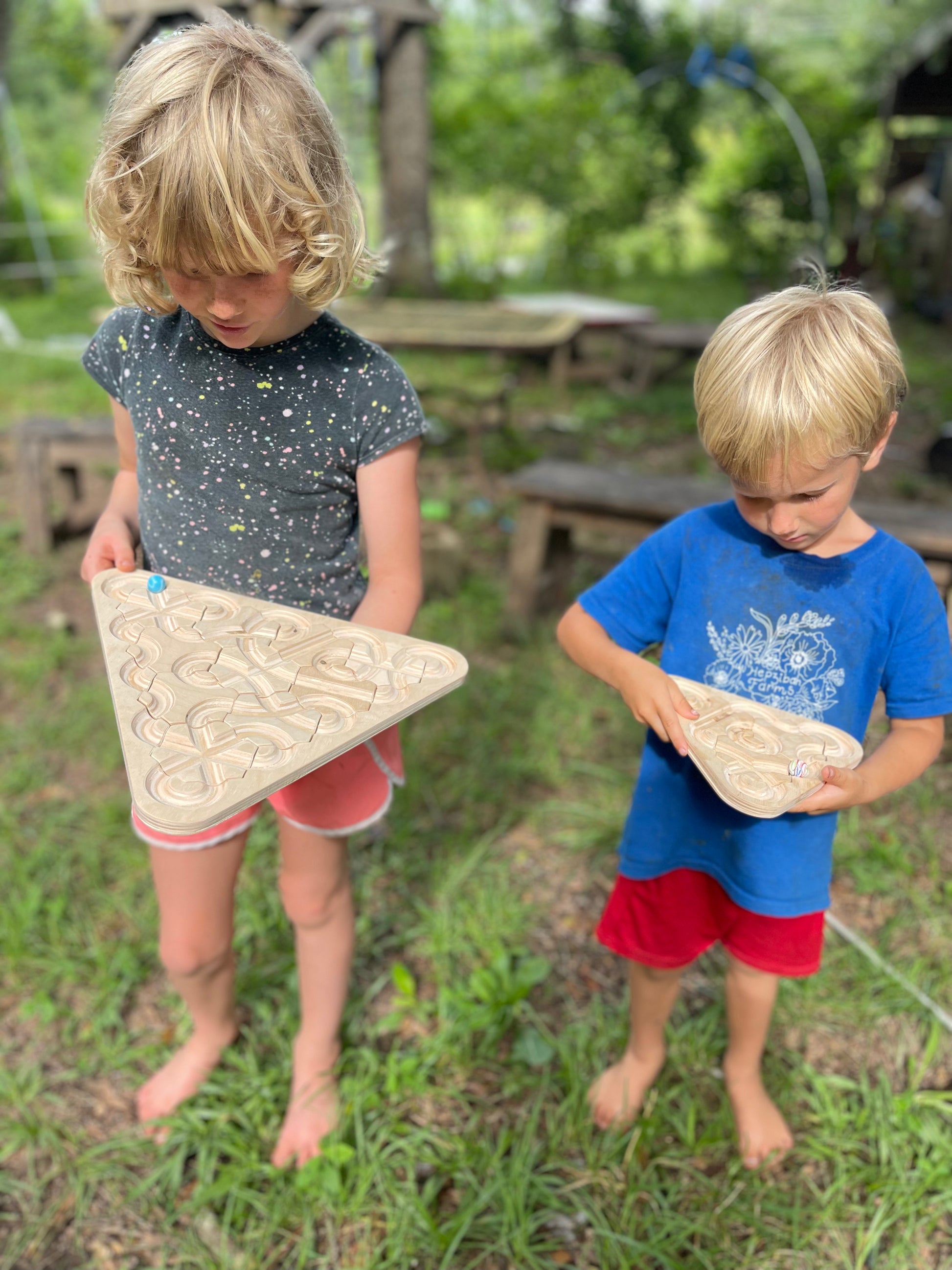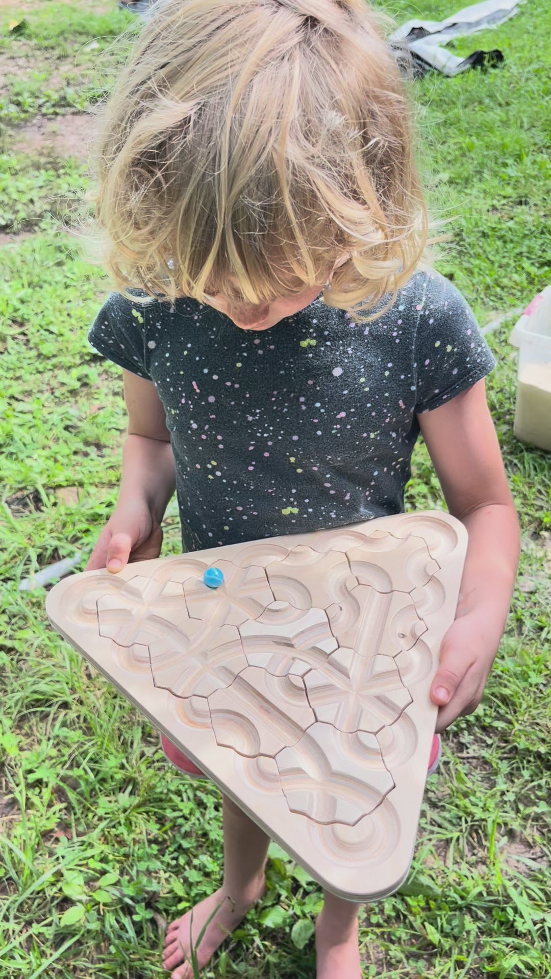 A new never ending mindfulness marble maze. Arrange the 10 hexagon tiles into the triangle board to create calming looping pathways. Control the movement of the marble by slightly tilting the board to keep it rolling. You can also just trace the path with your finger. Can be very meditative/addictive. There is no wrong way to arrange the tiles, they always connect to the tile next to them. It is possible (and easy) to make a single continuous loop that passes through each tile 3 different ways, or multiple, smaller, sometimes intersecting loops. You can make the path(s) symetrical or asymetrical. I am still figuring out the exact calculation for how many different ways there are to arrange the tiles on the board, but I think it is about a million. Enjoy! Includes 3 marbles and a cotton drawstring bag.